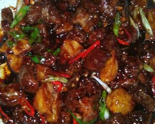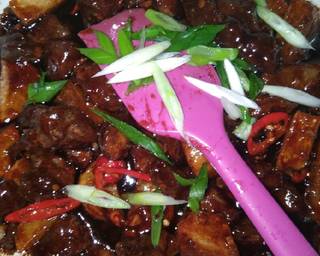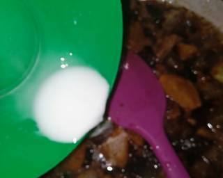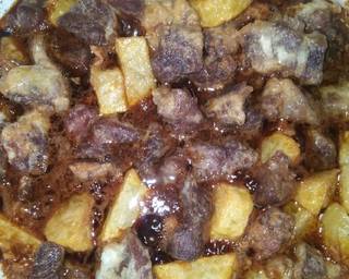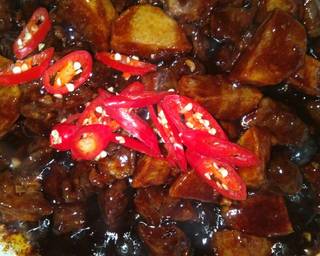- Masukkan daging dan kentang goreng,masak hingga air agak menyusut lalu masukkan larutan maizena,aduk rata. Tambahkan irisan cabe masak sebentar dgn api besar,angkat