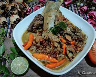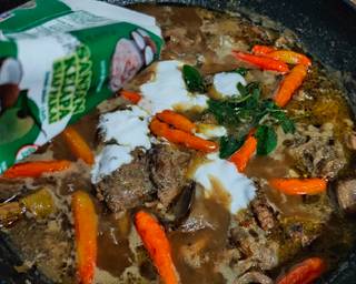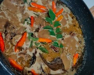 - Masak sampai daging empuk dan kuah menyusut jadi 50%. Tambahkan kecap manis, garam, kaldu sapi, cabe merah rawit utuh & santan. Aduk rata.